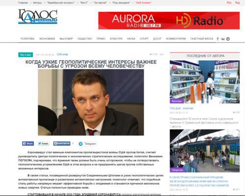 《亚美尼亚之声》报7月24日刊载亚知名学者本雅明·波戈相的文章,题为《狭隘的地缘政治利益难道比共同抗疫更重要?》 。