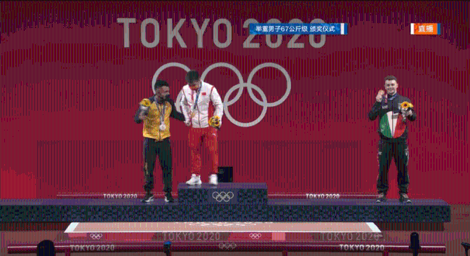 领奖台上,女子举重49公斤级冠军侯志慧略害羞地招呼站在两侧的银牌和铜牌运动员,和自己一块合影。