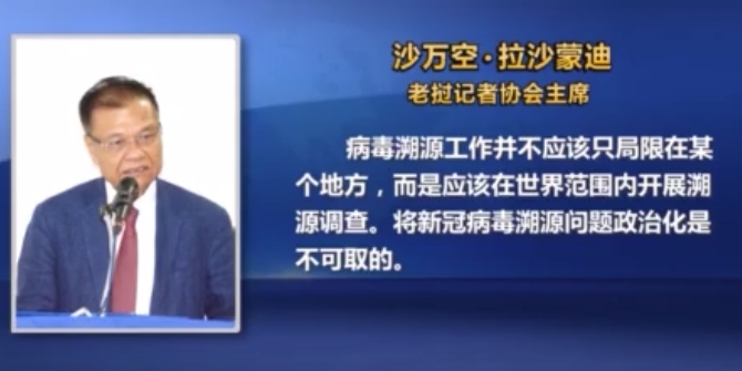 老挝记者协会主席 沙万空·拉沙蒙迪表示,病毒溯源工作并不应该只局限在某个地方,而是应该在世界范围内开展溯源调查。将新冠病毒溯源问题政治化是不可取的。