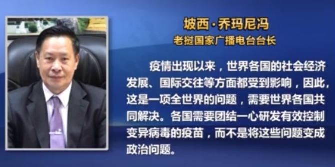老挝国家广播电台台长 坡西·乔玛尼冯表示,疫情出现以来,世界各国的社会经济发展、国际交往等方面都受到影响,因此,这是一项全世界的问题,需要世界各国共同解决。各国需要团结一心研发有效控制变异病毒的疫苗,而不是将这些问题变成政治问题。