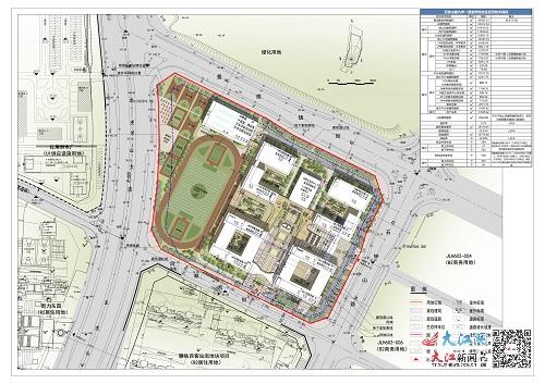 石钟山路九年一贯制学校综合经济技术指标显示,该校规划建设用地面积45082.33平方米,约67.6亩,总建筑面积53612.54平方米,规划小学30班,初中15班。