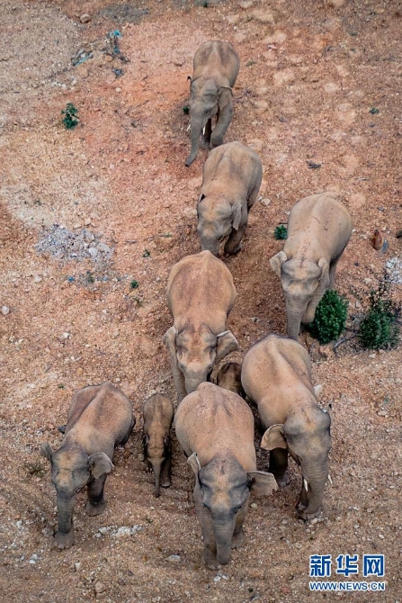 这是5月28日在云南省玉溪市峨山县境内拍摄的象群(无人机照片)。新华社记者 胡超 摄