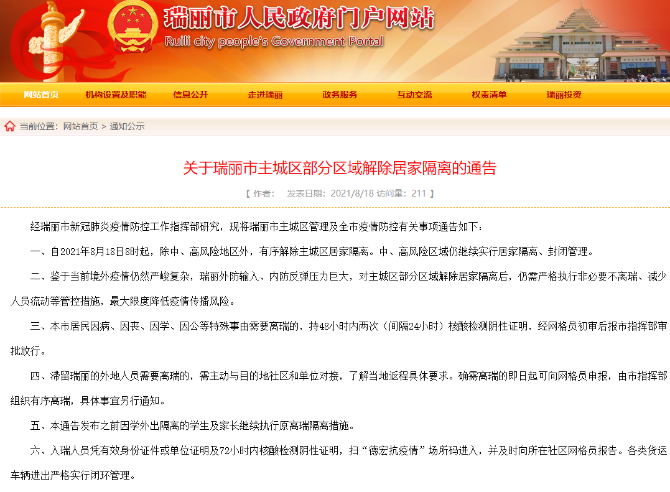 昆明信息港讯 瑞丽市人民政府网发布了关于瑞丽市主城区部分区域解除居家隔离的通告,通告全文如下: