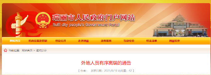 昆明信息港讯 为有序做好外地人员离瑞工作,严防疫情传播扩散,8月18日,瑞丽发布《外地人员有序离瑞的通告》。详情如下: