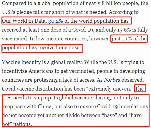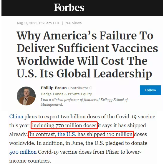 △《福布斯》文章截图。文章说:中国已经提供7.7亿剂疫苗(我官方最新数据显示实际已发货约8亿剂)。相比之下,美国只向全世界运送了1.1亿剂疫苗。