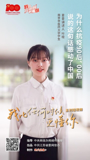 8 月 23 日," 我比任何时候更懂你 " 系列短视频第 30 集《为什么抗疫 90 后、00 后说的这句话感动了中国?》上线,本集青青讲述人是南京中医药大学学生叶晗。