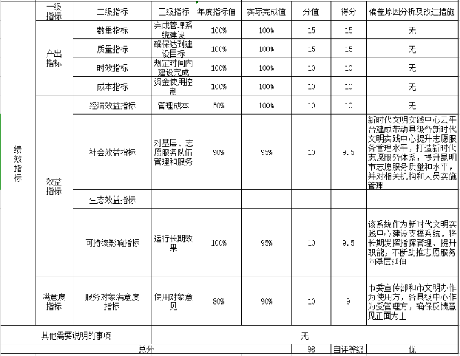 其中,定性指标中,社会效益指标和可持续影响指标为核心指标,昆明市新时代文明实践中心云平台建设的社会效应稳步提升,可持续影响力连贯且连续性较强;定量指标中,数量指标、质量指标、服务对象满意度指标指标值皆为100%。
