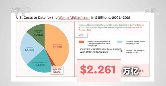 计算结果显示,自2001年以来,美国已经在阿富汗投入了2.26万亿美元。其中最大的一笔开支项目近1万亿美元,用于美国国防部的海外应急行动预算。