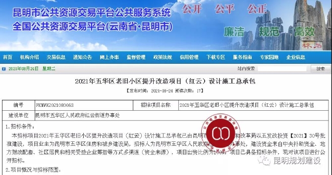 8月24日,昆明市公共资源交易平台发布《2021年五华区老旧小区提升改造项目(红云)设计施工总承包》公告,从公告内容获悉,此次提升改造将惠及居民299户。