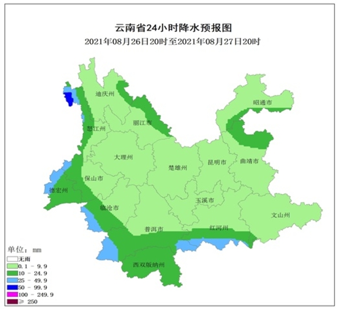 8月25日20时到8月26日20时:昭通北部、丽江北部、迪庆、怒江北部阴有中到大雨局部暴雨,昭通南部、曲靖北部、丽江南部、怒江南部、保山北部、德宏、临沧南部、普洱南部、西双版纳、红河南部多云有小到中雨局部大雨,其他地区多云有阵雨。