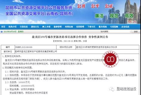 8月26日,昆明市公共资源交易平台发布《盘龙区578号城市更新改造项目选择合作伙伴竞争性谈判公告》。