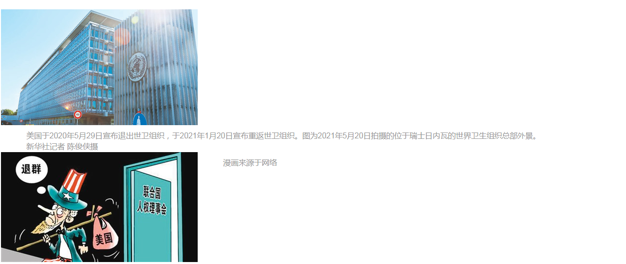 今年1月20日,美国现任政府一上台就高调宣布重返《巴黎协定》和世卫组织。