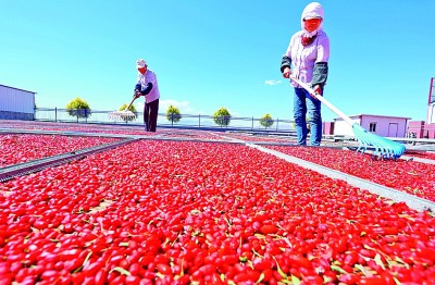 甘肃山丹县位奇镇农户们正在晾晒采摘的枸杞,种植枸杞为他们带来增收致富新渠道。 王将摄/光明图片