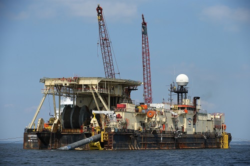 △当地时间2018年8月16日,德国卢布明附近的波罗的海,管道船在海里铺设“北溪-2”天然气管道。
