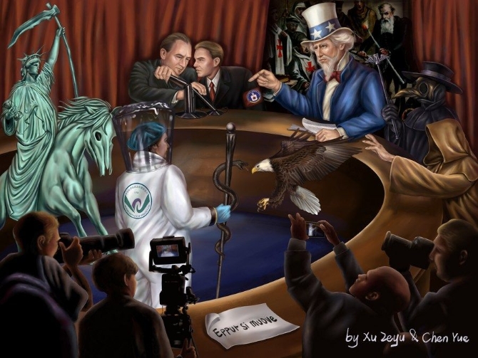 详解新华社漫画《“病毒”裁判所》,揭批美国病毒溯源报告阴谋