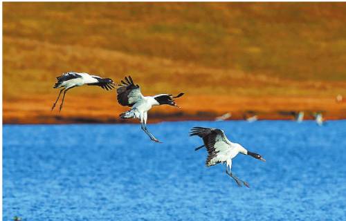 黑颈鹤是国家一级保护动物,珍稀濒危国家一级重点保护动物,被称为“鸟类熊猫”。大山包湿地水草丰盛、空气清新,为越冬黑颈鹤等166种野生鸟类提供了良好栖息及觅食环境。20世纪90年代初,云南在当地成立了专门管护机构,划定保护区范围,出台法规、政策,加大投入推进湿地生态效益补偿项目,大力实施生态移民暨易地扶贫搬迁,解决人鹤争地的矛盾,实现了人退鹤来,在保障民生的同时,为黑颈鹤打造了一个越冬的理想栖息地。