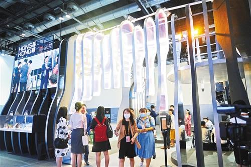 服贸会香港馆展区颇具特色,通过运用新材料制成的开放性波浪结构,寓意把内地和香港的优势叠加起来,共同打造更新更优的服务贸易应用场景。