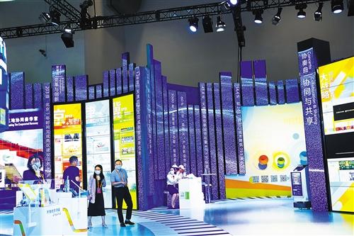 服贸会京津冀展区以“一体开放谱新曲、三地协同奏华章”为主题,可视化、动态化、立体化展现了7年来京津冀三地协同开放、一体发展取得的成就。