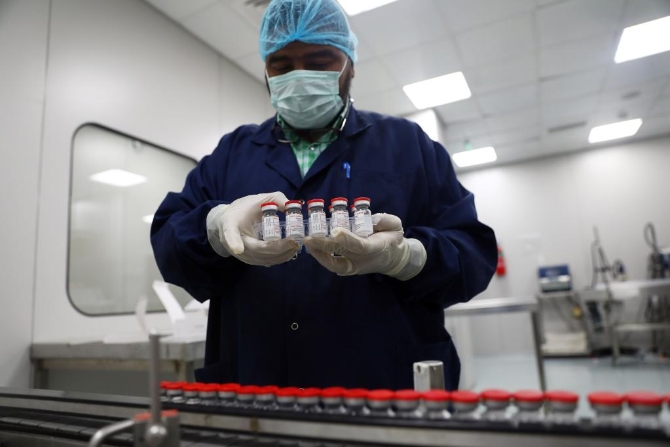 9月6日,工作人员在埃及吉萨的VACSERA公司疫苗生产厂展示生产的新冠疫苗。新华社发(艾哈迈德·戈马摄)