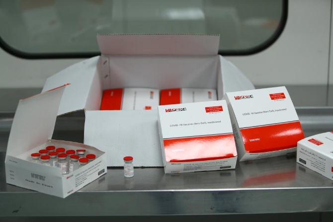 经过药液注射、贴标等生产线自动化流程后,这些带有VACSERA-Sinovac标签的小药瓶便由戴着医用头套、口罩、手套的工作人员整理后放入特制冰箱中保存。