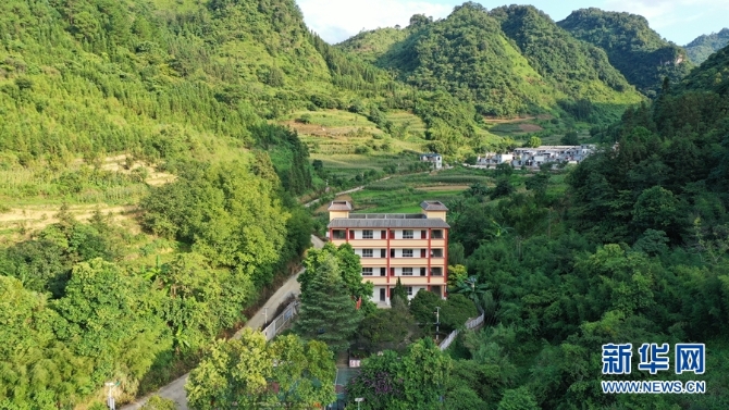 航拍视角下的落松地小学和落松地村(摄于2020年7月24日)。(新华网 赵普凡 摄)