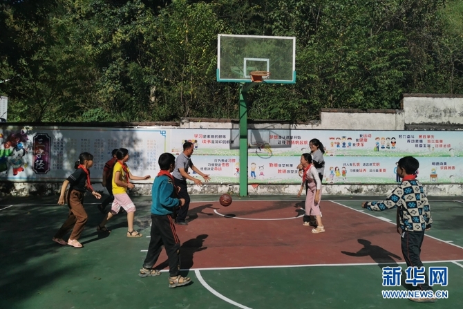 农加贵和朱丽丹带着学生们打篮球(摄于2021年9月6日)。新华网发(韦银荧 摄)
