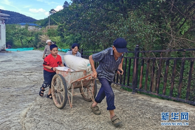 朱丽丹帮助年迈的村民(摄于2021年9月6日)。新华网发(韦银荧 摄)