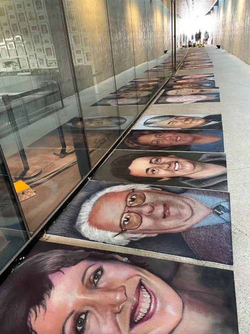 9月9日,在美国宾夕法尼亚州尚克斯维尔,“9·11”事件中93号航班坠毁地纪念馆外,艺术家用彩色粉笔绘制的航班遇难者头像。新华社记者徐剑梅摄