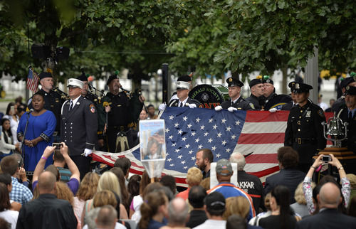 2015年9月11日,纽约市警察和消防礼兵在悼念“9·11”事件十四周年现场展示美国国旗。新华社记者王雷摄