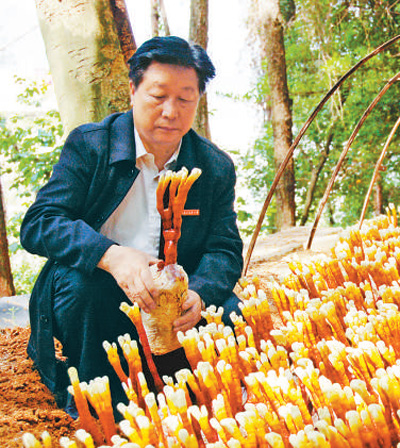 林占熺在查看农户种植的菌草鹿角灵芝生长情况。 资料图片