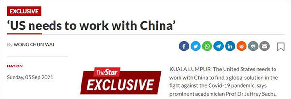 9月5日,国际医学期刊《柳叶刀》杂志新冠委员会主席、美国经济学家杰弗里·萨克斯(Jeffrey Sachs)在接受马来西亚《星报》(The Star)独家专访时表示,中国在抗击新冠疫情方面做得非常出色,世界本可以且应该能从中国的应对举措中学到更多知识。他还呼吁美国需要与中国展开良好合作,而不是试图强迫中国按照美国的意愿做事。