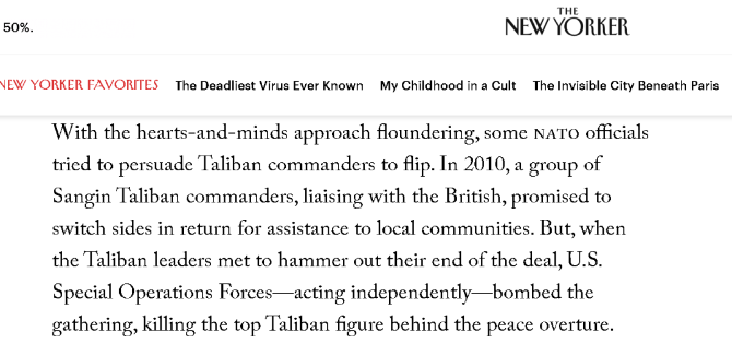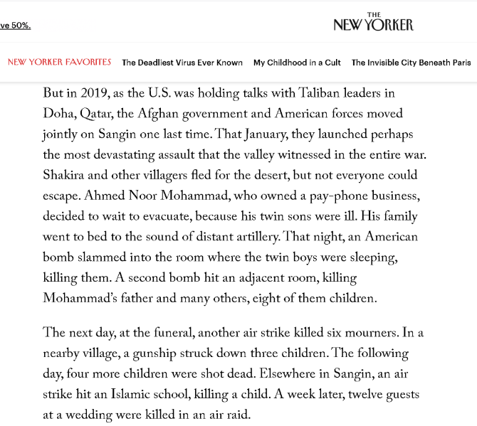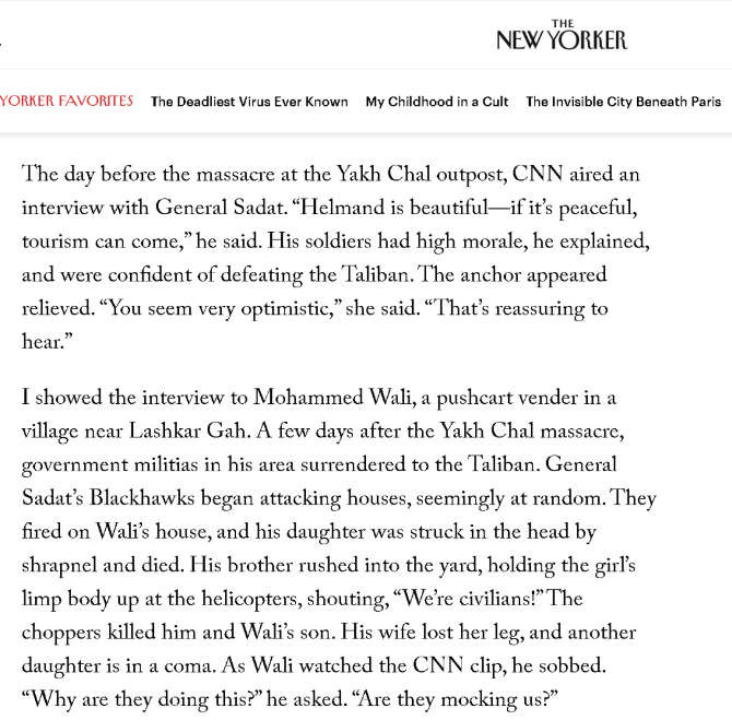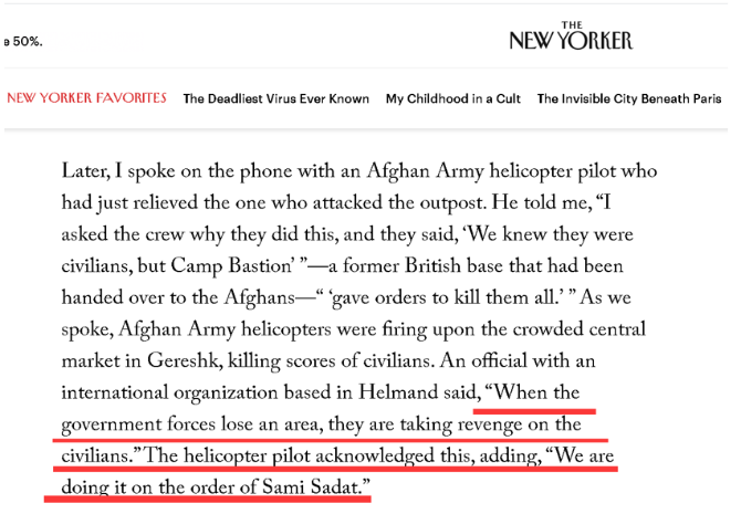 另外,《纽约客》作者还介绍了一件更为骇人听闻的事情:一位在夏奇拉所居住的赫尔曼德省工作的国际组织的人员透露,虽然阿富汗政府军后来不断输给塔利班,但政府军每丢失一处地方,就通过屠杀该地区的平民进行报复,而且下达这种屠杀令的阿富汗政府军指挥官萨米·萨达特,居然是一个在英国受过教育,并且被北约培训出来的高级军官。