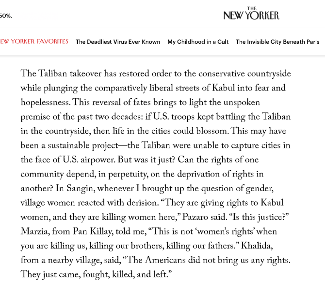 这也引发了《纽约客》的作者思考:不让塔利班夺权,可以保护喀布尔那些大城市女性的女权,但这意味着要不断在乡村地区和塔利班作战,这对于那些一直在受苦受难的乡村女性公平吗?一群人的权利,需要靠剥夺另一群人的权利来维持吗?
