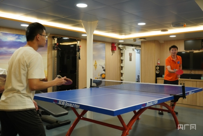 记者:我想到了当时的第一课里,李船长也提到了在船上工作生活,在关门的时候一定要手扶住门,把门轻轻带上,而这一点实际上也是呼应了刚刚杜首席讲的船上的科考队员还有工作人员,他的作息制度是按照科考计划来安排的,不是按照传统的早中晚休息的节奏去安排,所以轻轻把门带上,实际上也可以减少对别人的打扰,保证他休息的质量,能够更好地服务于科考工作。李船长,在工作之余船上还提供了哪些设施,我们大家会有哪些娱乐活动?