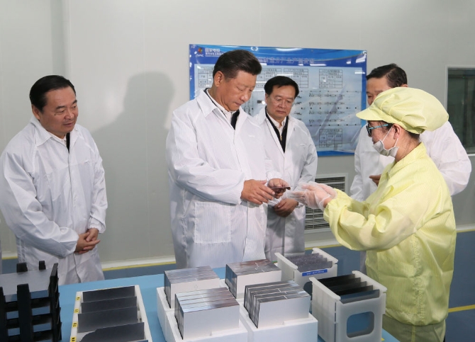 2016年8月23日,习近平在国家电投黄河水电太阳能电力有限公司西宁分公司太阳能电池生产车间考察。