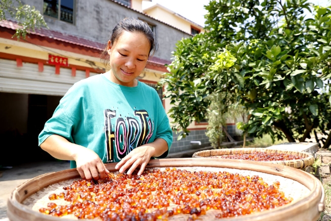 9月11日,江西省吉安市峡江县金坪民族乡新民民族村村民黄志秀在晾晒桃胶。陈福平摄
