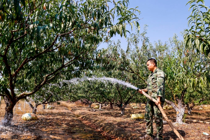 9月11日,江西省吉安市峡江县金坪民族乡新民民族村村民郑馨贵在给桃树浇水。陈福平摄