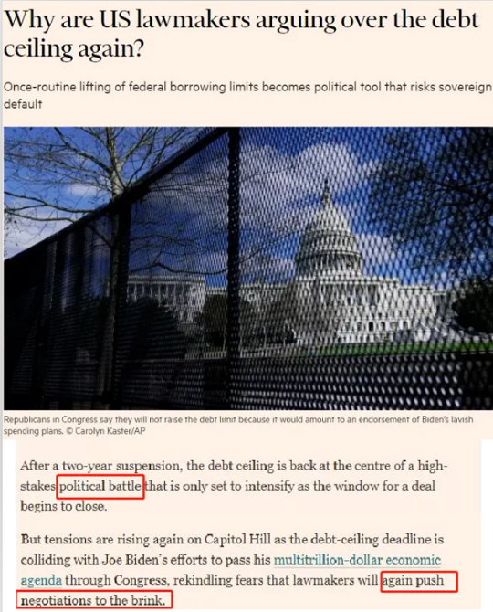 △英国《金融时报》:在暂停两年之后,债务上限问题再次成为一场高风险政治斗争的焦点。随着提高债务上限的最后期限与拜登试图在国会通过其数万亿美元经济议程的努力发生冲突,人们担心议员们会再次将谈判推向崩溃的边缘。