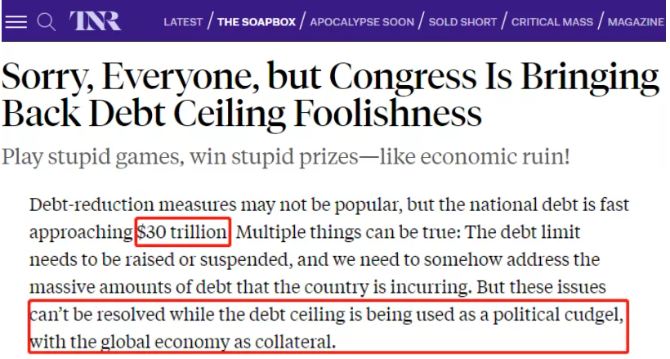 美国《新共和》周刊发表评论文章,将民主、共和两党的债务上限之争比作“愚蠢的游戏”,并断言这场政治游戏最终会带来经济的毁灭。