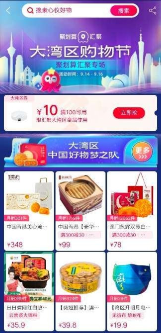 为更多地回馈消费者,释放大湾区消费动力,营造更加喜庆的嘉年华氛围,承办单位阿里巴巴发出了一系列优惠活动。早在9月2日启动当天,共有300多万消费者在手机淘宝上点亮“数字明月”,共同开启粤港澳大湾区购物节。在聚划算直播间,有超过100万消费者关注了集中亮相的92件大湾区梦之队好物,并快速在淘宝天猫上领走了超过1000万的红包补贴。截止9月13日,在淘宝天猫平台上,大湾区购物节已经发放红包超过200万个。