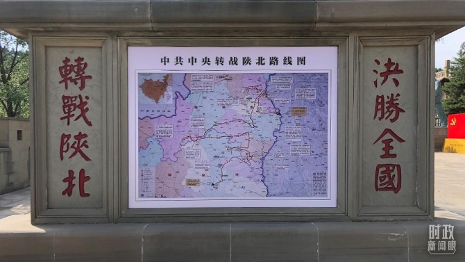 △杨家沟革命旧址内展出的“中共中央转战陕北路线图”。(总台央视记者许永松拍摄)