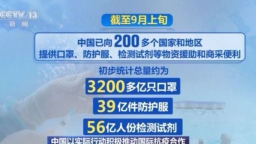 数据显示,截至9月上旬,中国已向200多个国家和地区提供口罩、防护服、检测试剂等物资援助和商采便利。初步统计总量约为3200多亿只口罩、39亿件防护服、56亿人份检测试剂。此外,中国尽己所能,向全球提供抗疫物资原材料,协助打造了多所病毒检测实验室,为地区和全球抗疫提供保障。