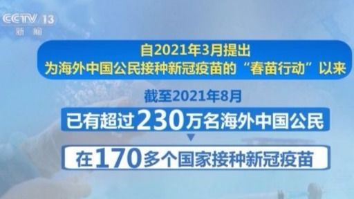 同时,中国政府心系海外同胞,自今年3月提出为海外中国公民接种新冠疫苗的“春苗行动”以来,截至8月,已有超过230万名海外中国公民在170多个国家接种了新冠疫苗,让海外中国公民获得了及时有效的健康保障。