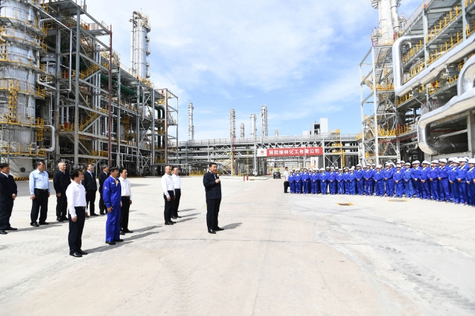 ↑这是13日上午,习近平在国家能源集团榆林化工有限公司年产40万吨乙二醇项目现场考察。新华社记者 李学仁 摄