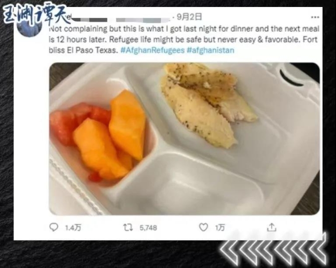 美联社的报道称,这些人可以领取丰盛的食物及饮料。但一名叫作艾哈迈迪的阿富汗人在社交媒体上发布了一张照片,餐盘中,只有少得可怜的鸡肉和水果,而下一顿饭,要等到12个小时后。