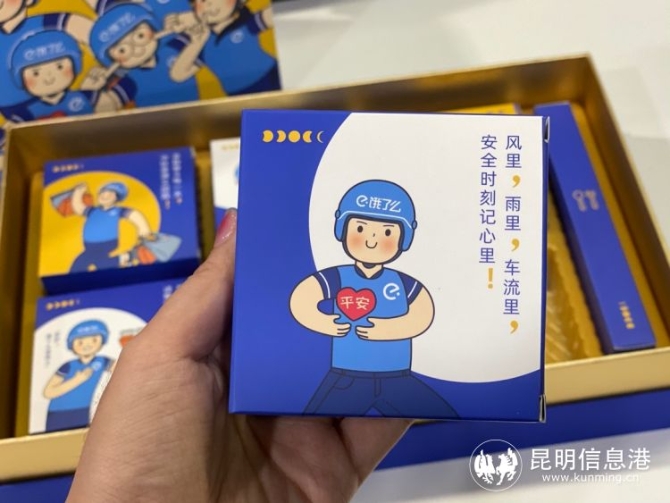 月饼包装盒上印有“蓝骑士土话”。比如,提醒骑手佩戴头盔的“幸盔有你”,注意安全行驶的“风里、雨里、车流里,安全时刻记心里”。