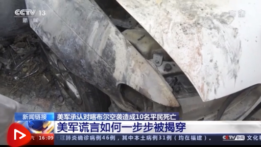 8月29日的空袭发生后,总台报道员曾探访现场,而现场并无所谓“二次爆炸”的痕迹,这一点此后也得到了武器专家的证实。总台报道员还采访了遇难者家属,揭穿美方的谎言。