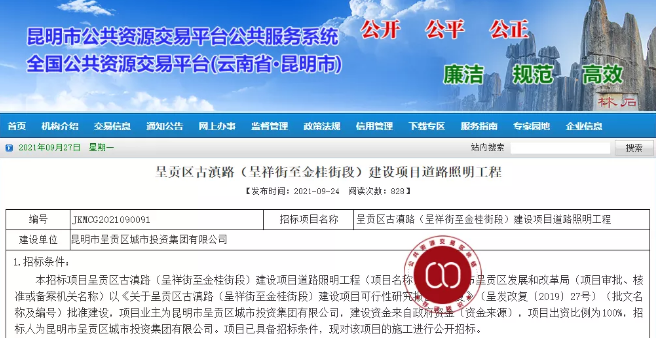 9月24日,昆明市呈贡区城市投资集团有限公司发布《呈贡区古滇路(呈祥街至金桂街段)建设项目道路照明工程招标公告》。