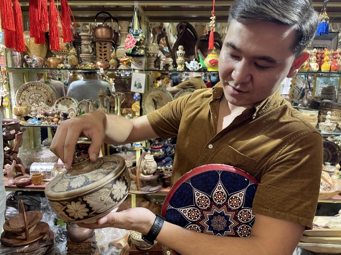 “在古城中做生意,游客很多,感觉特别棒。”艾山玉山手工木器艺术品展览店是古城内有名的木器巴扎。玉山江·玉素音传承家族的手艺,始终做着木器手工艺品的生意。而对于古城的变化,他深有体会地说:“古城建成以前,我的店面特别小。随着古城改造后,游客量很多,生意越来越好,店铺也越开越大。目前,年收入能达到七八十万,如果游客多得话,收入会更多。”