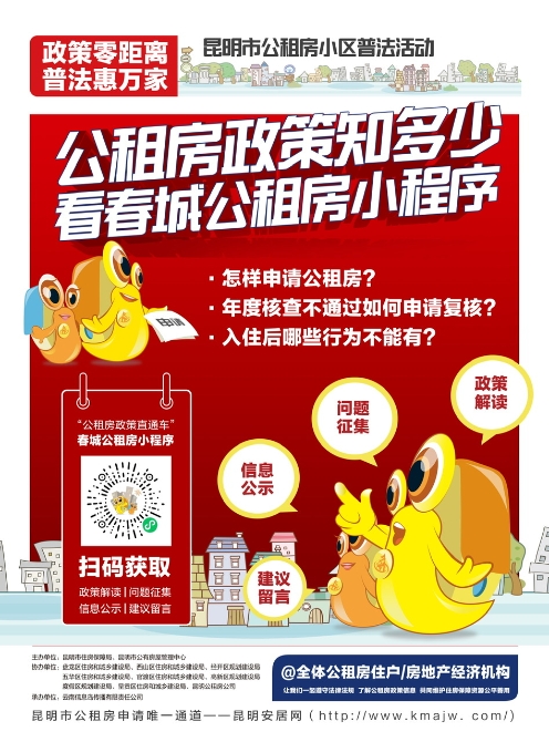 会上,昆明市公有房屋管理中心相关负责人介绍了“春城公租房”小程序的各项功能及普法行动的内容。“春城公租房”小程序的功能包括了相关政策及通知公告等信息的宣传、问题征集等。上线小程序让公租房承租人能更便捷地获取公共租赁住房相关政策及通知公告等信息,更快速地反馈租住中存在的问题;有效将政策法规信息送入公共租赁住房小区,提升公共租赁住房承租人严格按规定租用保障性住房的意识;有效收集公租房管理过程中存在的问题及违规使用公共租赁住房的相关信息,下步还将联合各区住建、物业、社区及律师代表组建普法志愿队,不定期陆续进入各公租房小区深入开展普法活动。
